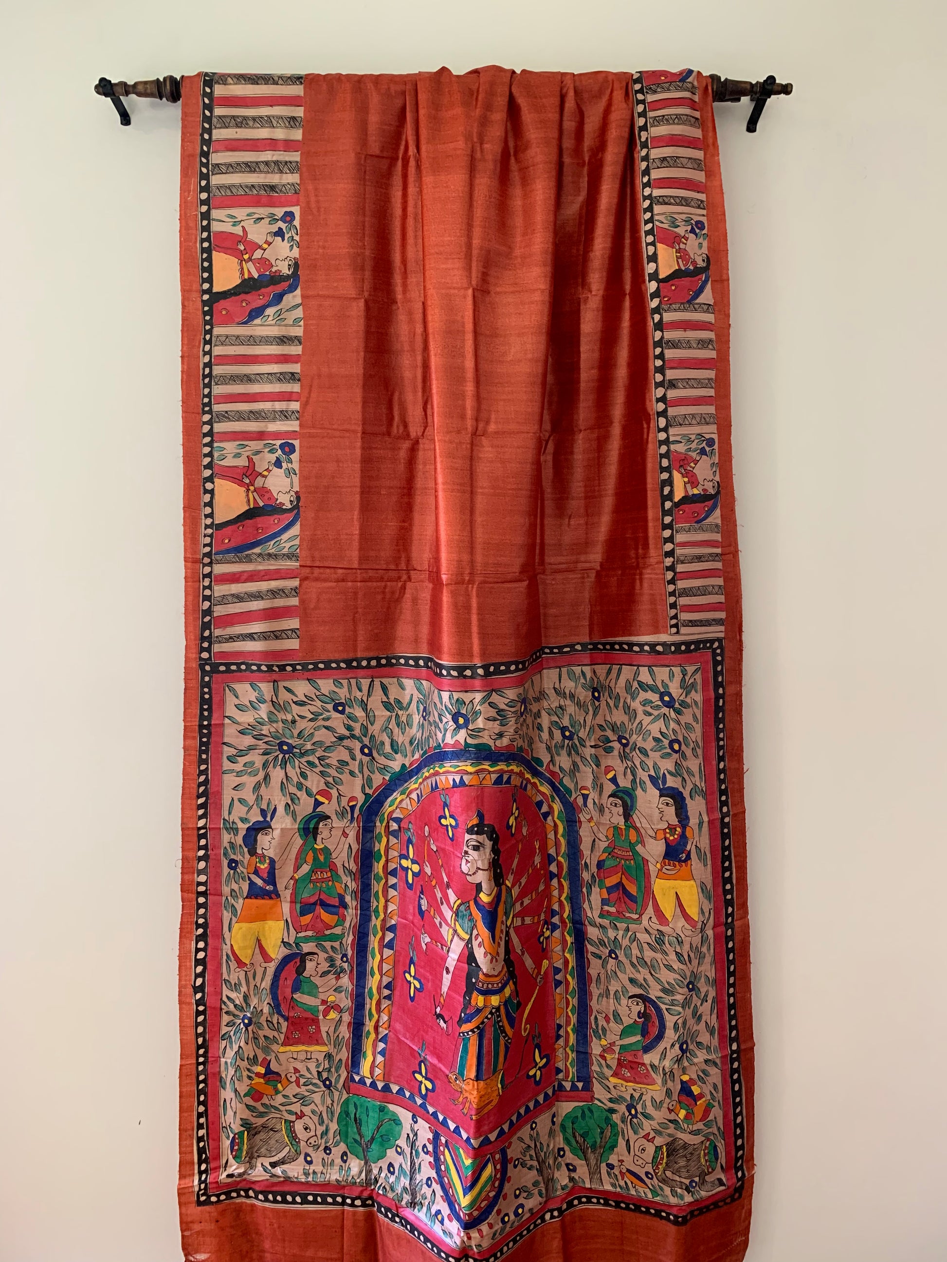 HANDWOVEN Handpainted Madhubani in Orange Gicha Tussar | SILK MARK Certified