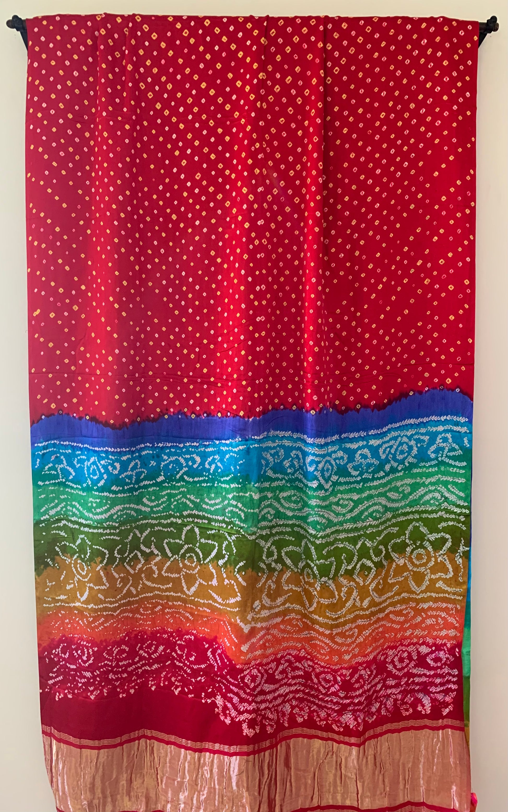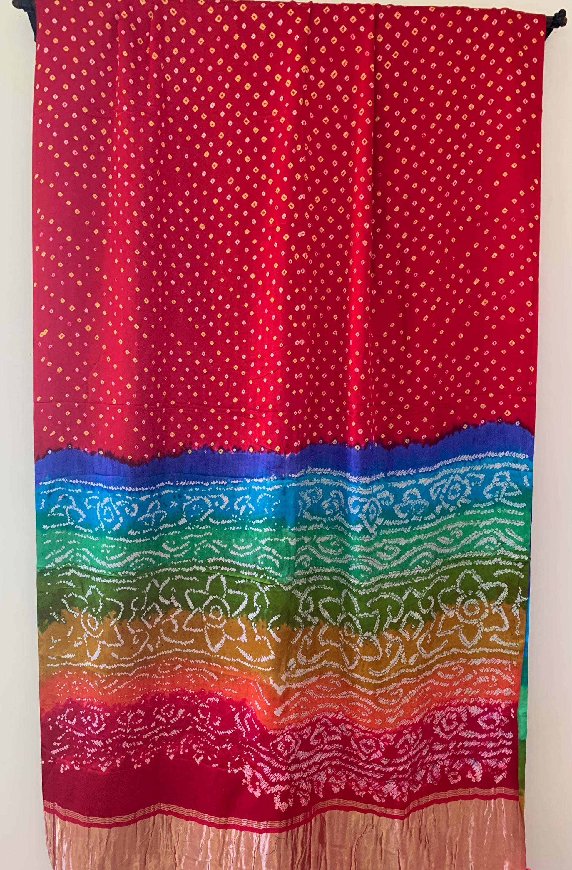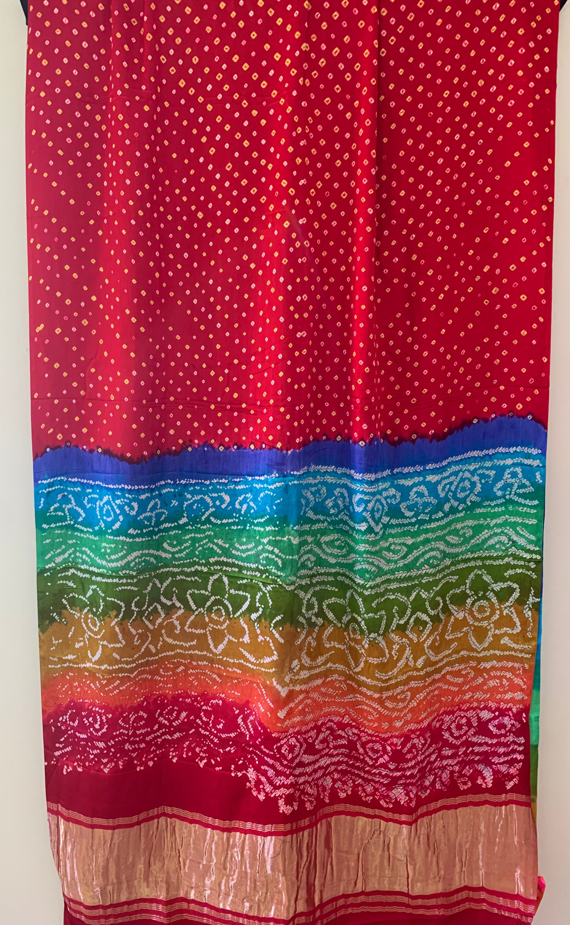 HANDWOVEN RED Gajji silk with rainbow Pallu
