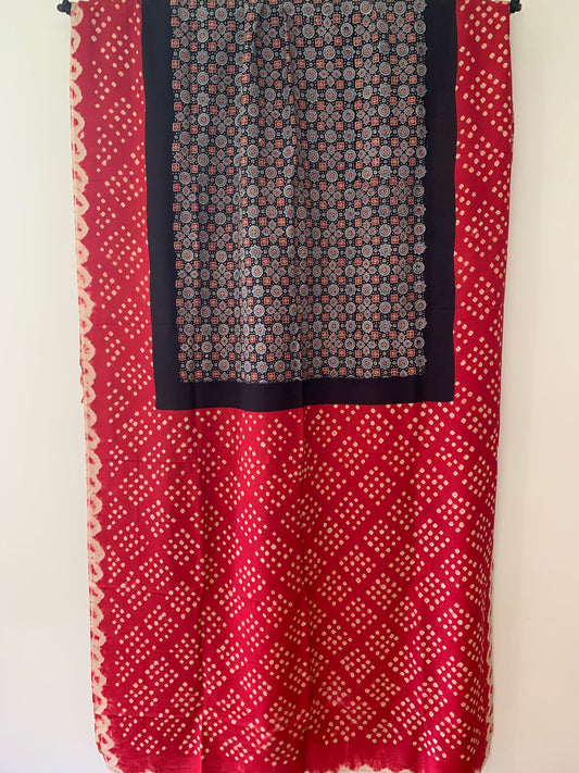 Ajrak Body with Red Bandhani Pallu & Blouse